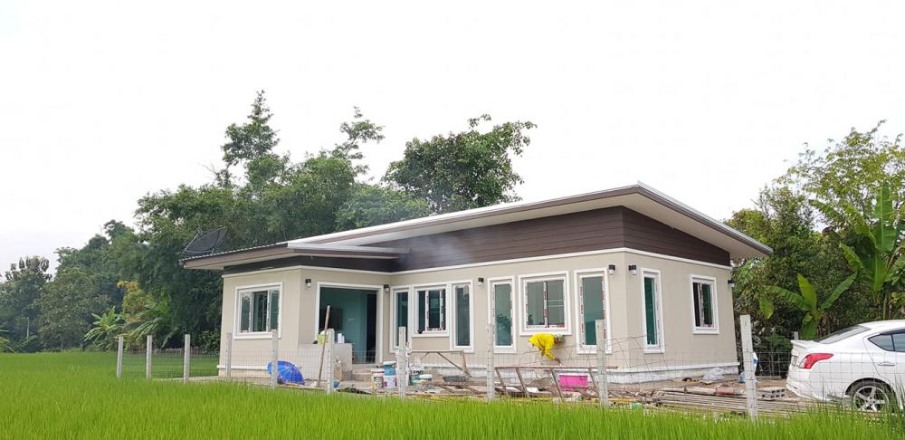 ขออนุญาตแอดมินครับ ส่งผลงานบ้านสไตล์โมเดิร์นจบที่งบ6แสน5รวมตกแต่งพื้นที่ใช้สอย72ตรม ขนาด2ห้องนอน4×3.50 และ3×3.50 1ห้องน้ำและโถงวัสดุใช้เสาสำเร็จ หลังนี้พิกัดเชียงราย